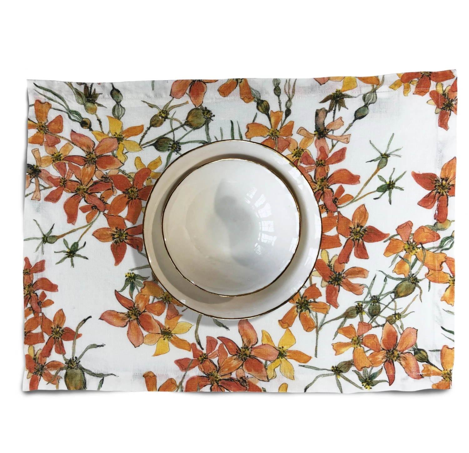 Our founding prints are an elegant ‘Fern’; the vibrant ‘Wild Rose’; and the delicate ‘Yellow Rose’, printed on tablecloths, placemats and napkins.