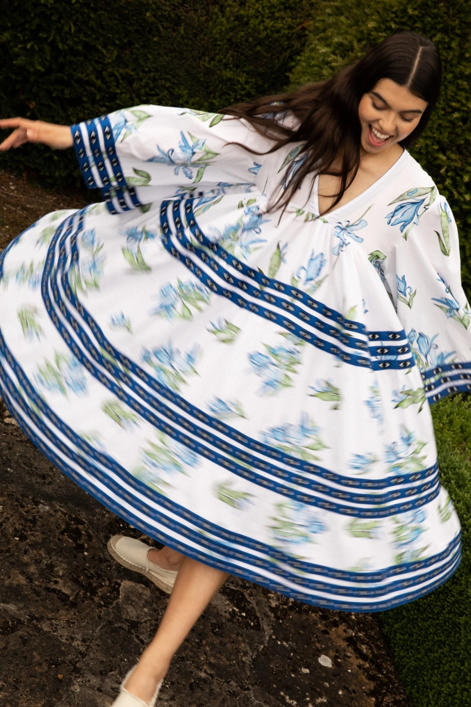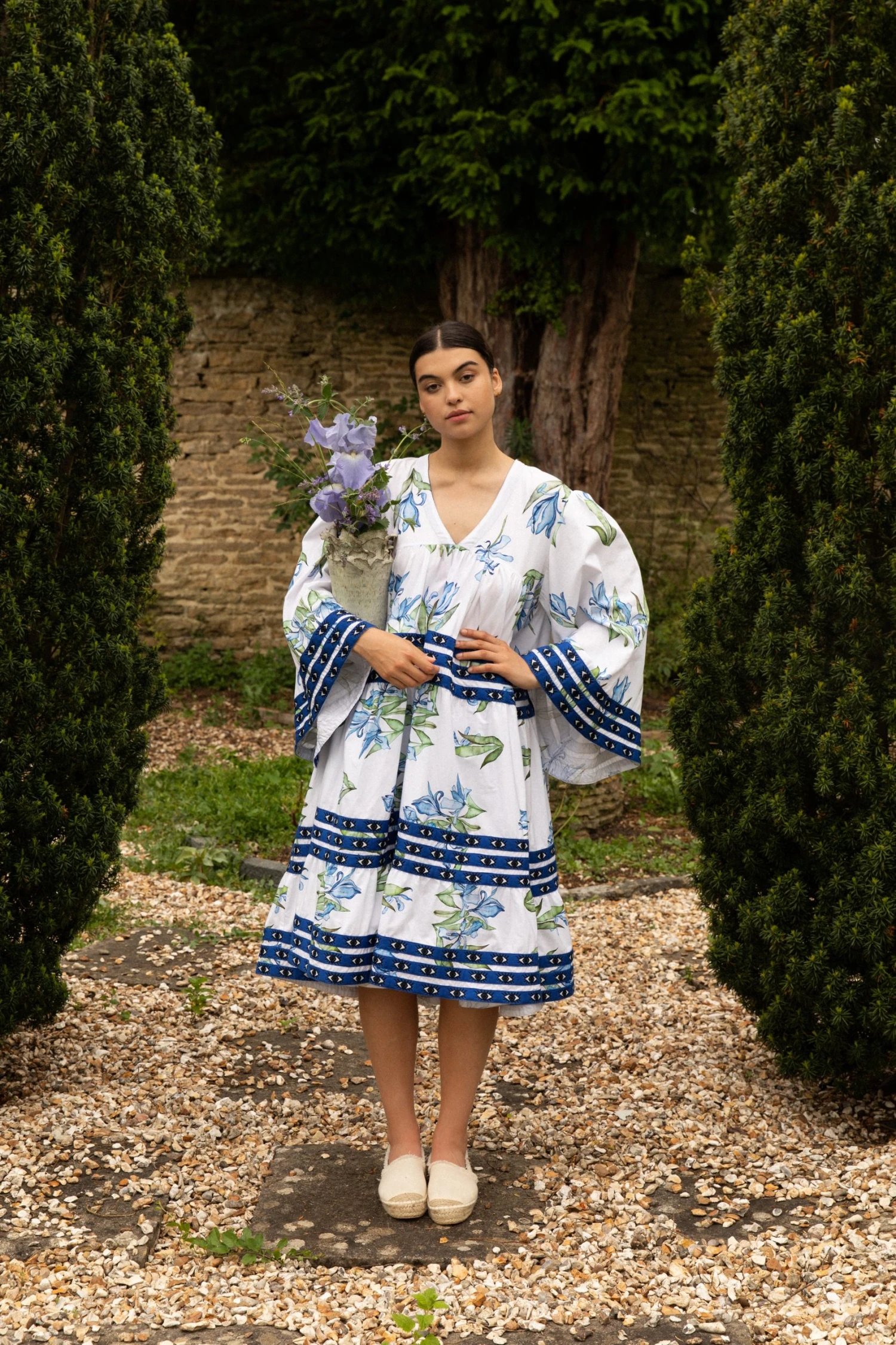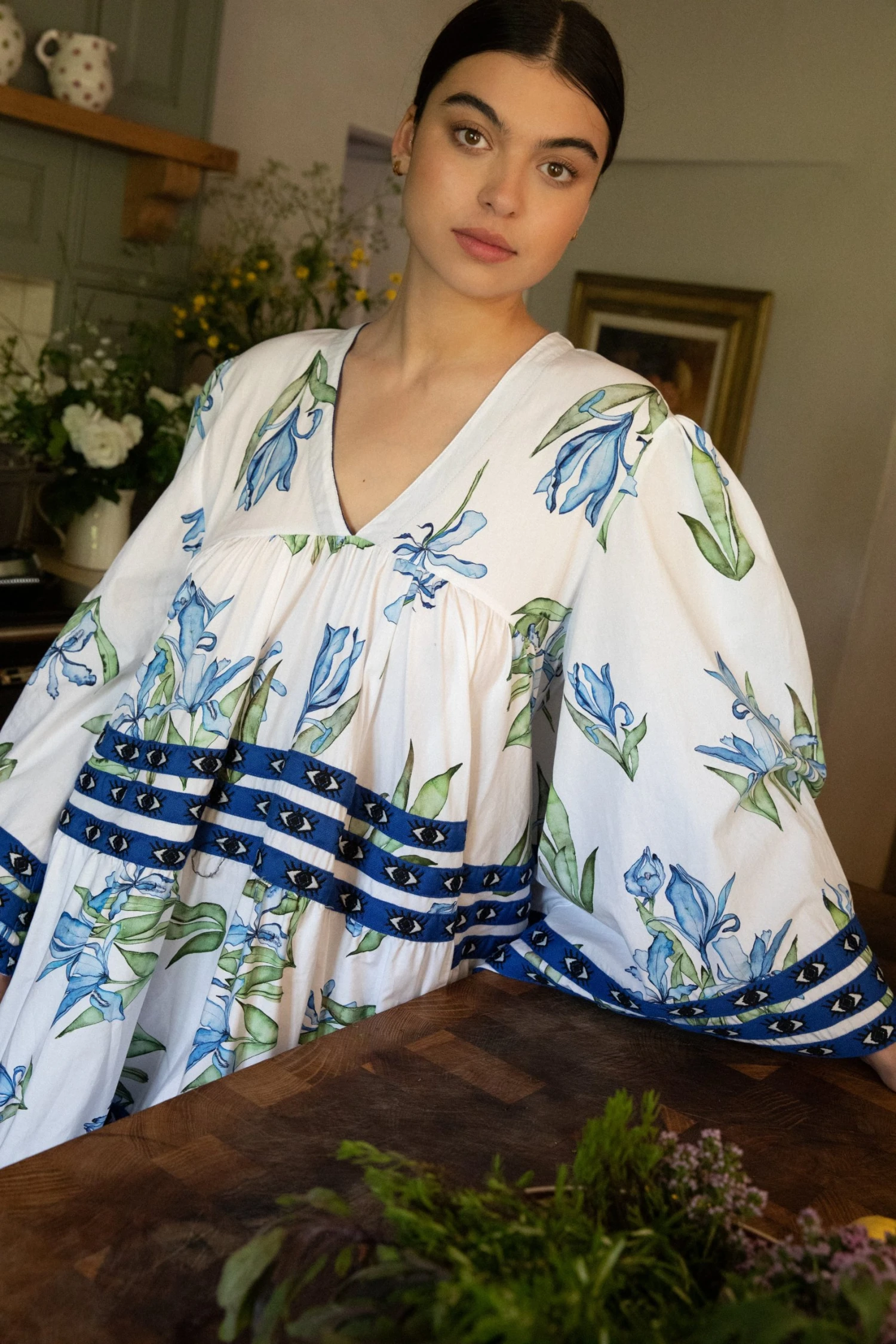 We have collaborated with Greek designer Flora Sardalos for this capsule collection. Caryn painted a beautiful collection of botanicals inspired by Greece. Flora combined the printed cotton fabric with her signature voluminous dresses and trim details to create this stunning collection of dresses.