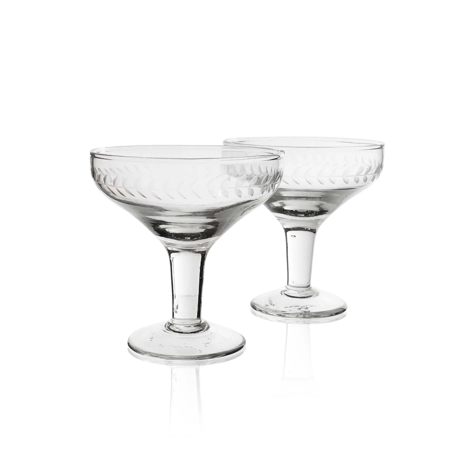 An antique inspired champagne coupe made from recycled glass. A delicate leaf wreath design etched around the rim.Â